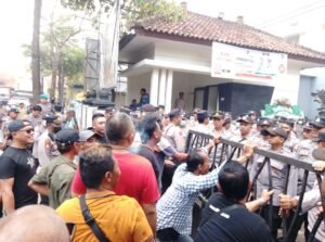 Demonstran Aliansi Gayatri didepan gerbang kantor DPRD Kabupaten Tulungagung dengan pengamanan ketat, Senin(6/10/2025).