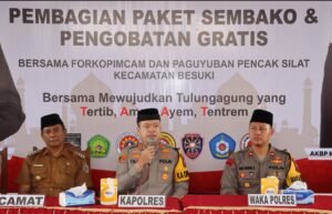 Camat Besuki, Kapolres Tulungagung dan Waka Polres Tulungagung. Polres Tulungagung menunjukkan kepedulian sosial melalui kegiatan Bakti Sosial (Baksos) Presisi di Balai Desa Tanggul Welahan, Kecamatan Besuki, Senin (24/03/2025).