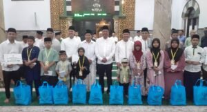 Bupati Gatut Sunu Wibowo dan Wakil Bupati Ahmad Baharudin bersama anak-anak penerima santunan dan takmir Masjid Jami Al Huda , Kelurahan Tamanan, Tulungagung, Senin (10/3/2025).