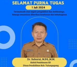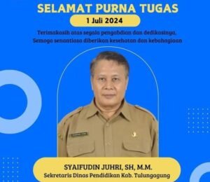 Rahadi menambahkan, seperti masa kerja Sekretaris Pendidikan, Bapak Syaifudin Juhri, SH, MM, dan Kepala Bidang Pembinaan Sekolah Dasar, Bapak Dr. Suharni, M.Pd, MM, yang secara bersamaan resmi mengakhiri masa bakti mereka sebagai pegawai di Dinas Pendidikan Kabupaten Tulungagung per tanggal 1 Juli 2024.