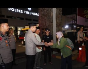 TULUNGAGUNG, HARIAN-NEWS.com_ – Kapolres Tulungagung, AKBP Muhammad Taat Resdi, bersama Wakil Bupati Tulungagung, Ahmad Baharudin menyambut hangat kedatangan peserta program Mudik Seru Bareng NU di halaman Mapolres Tulungagung, Rabu (26/03/2025) dini hari.