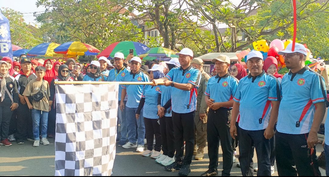 HUT PGRI ke 80 di Tulungagung, Bupati Tulungagung Gatut Sunu Wibowo dengan bendera start menandai kegiatan Jalan Sehat PGRI Tulungagung 2025