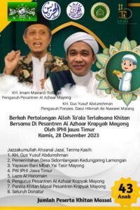 Sekretaris Pesantren Al Azhaar Krapyak Mayong, Kang Suyuti melaporkan bahwa peserta khitan masal sebanyak 41 anak dari daerah Kecamatan Kedungpring, Kecamatan Sugio dan beberapa kecamatan lainnya. Mereka yang ikut dapat fasilitas sarung, baju, kopyah, alat tulis dan uang saku. Pesantren Krapyak Mayong Mlangean Kedungpring Lamongan menyampaikan terima kasih pada pengurus IPHI Jawa Timur, Lazis Al Haromain, pemerintah desa Sidomlangean, KH. Gus Yusuf dan seluru donasi yang telah berjariyah. Semoga jariyah dan jerih payah diterima Alloh Ta’ala dan dibalas surga Alloh Ta’ala.