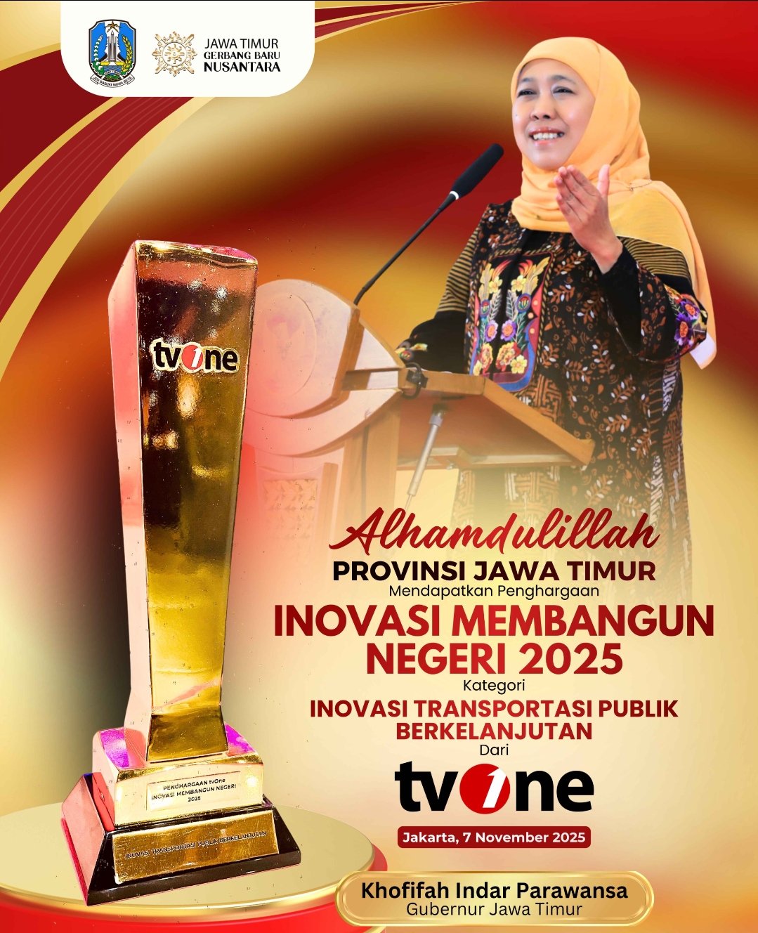 JAKARTA, HARIAN-NEWS.com — Pemerintah Provinsi Jawa Timur kembali menorehkan prestasi membanggakan di tingkat nasional. Gubernur Jawa Timur Khofifah Indar Parawansa menerima Penghargaan Inovasi Membangun Negeri 2025 Bidang Innovation Public Service Subkategori Inovasi Transportasi Publik Berkelanjutan melalui program Bus Trans Jatim.