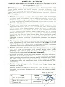 Demikian salah satu point yang tertuang Maklumat Bersama Ulama dan Umaro Kabupaten Blitar Dalam Mencegah dan Memutus Mata Rantai Penyebaran Covid-19 yang ditandatangani oleh Bupati Blitar, Drs. H. Rijanto, MM, Kapolres Blitar, AKBP Ahmad Fanani Eko Prastyo, SIK, Kapolre Blitar Kota, AKBP Leonard Marojohan Sinambela, SH., SIK., MH, Komandan Kodim 0808, Letkol Inf. Krisbiantoro, Kepala Kejari, Bangkit Sormin, SH., MH, Ketua PN, Anak Agung Gede Agung Parnata, SN., C.N, Ketua DPRD, Suwito Saren Satoto, S.Sos, Ketua MUI, Drs. KH. Ahmad Zamroji, MH, Ketua PC NU, KH. Masdain Rifai, SH, Ketua PD Muhammadiyah, H. Hidayaturrahman, SE., MM, Ketua LDII, H. Sugiyono, S. Apt., Ketua FKDM, H. Moch. Djais, BA, Ketua FKUB, Drs. KH. Agus Muadzin, M.PdI, Ponpes Al Falah, KH. Ardani Ahmad, Ponpes KH. Azizi Chasbullah, Ponpes Sirojuth Tholibiin, KH. Harun Syafii, DMI, Kyai Farkhan Ma’ruf, Kadinkes dr. Kuspardani, Kakankemenang, H. Muhammad Baidowi, M. Ag, Senin (20/4/2020).