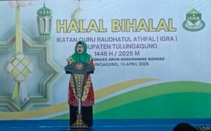 TULUNGAGUNG, HARIAN-NEWS.com – Wakil Bupati Tulungagung, Ahmad Baharudin, menegaskan pentingnya silaturahmi sebagai fondasi kehidupan sosial dan profesional saat menghadiri Halal Bihalal Ikatan Guru Raudhatul Athfal (IGRA) Kabupaten Tulungagung di Pendopo Kongas Arum Kusumaning Bongso, Senin (15/4/2025).