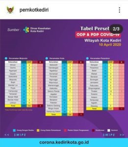 Hingga, Jum’at (10/4/2020) Kota Kediri saat ini Orang Dalam Resiko (ODR) 1.009, Orang Dalam Pemantauan (ODP) 149, Pasien Dalam Pengawasan (PDP) 3 dan terkonfirmasi positif virus corona 6 orang. Dalam perawatan 5 orang dan sembuh 1 orang. [git]